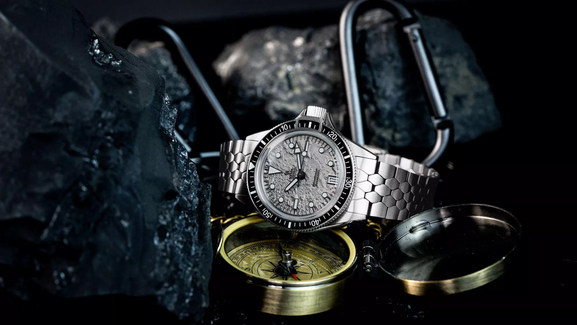 這款腕錶的設計靈感源自月球的礦物表面,鈦金屬錶盤採用油壓工藝在噴砂底面上打造而成,呈現出微妙的環形山紋理,如同月光灑落在海面上般變幻莫測。
