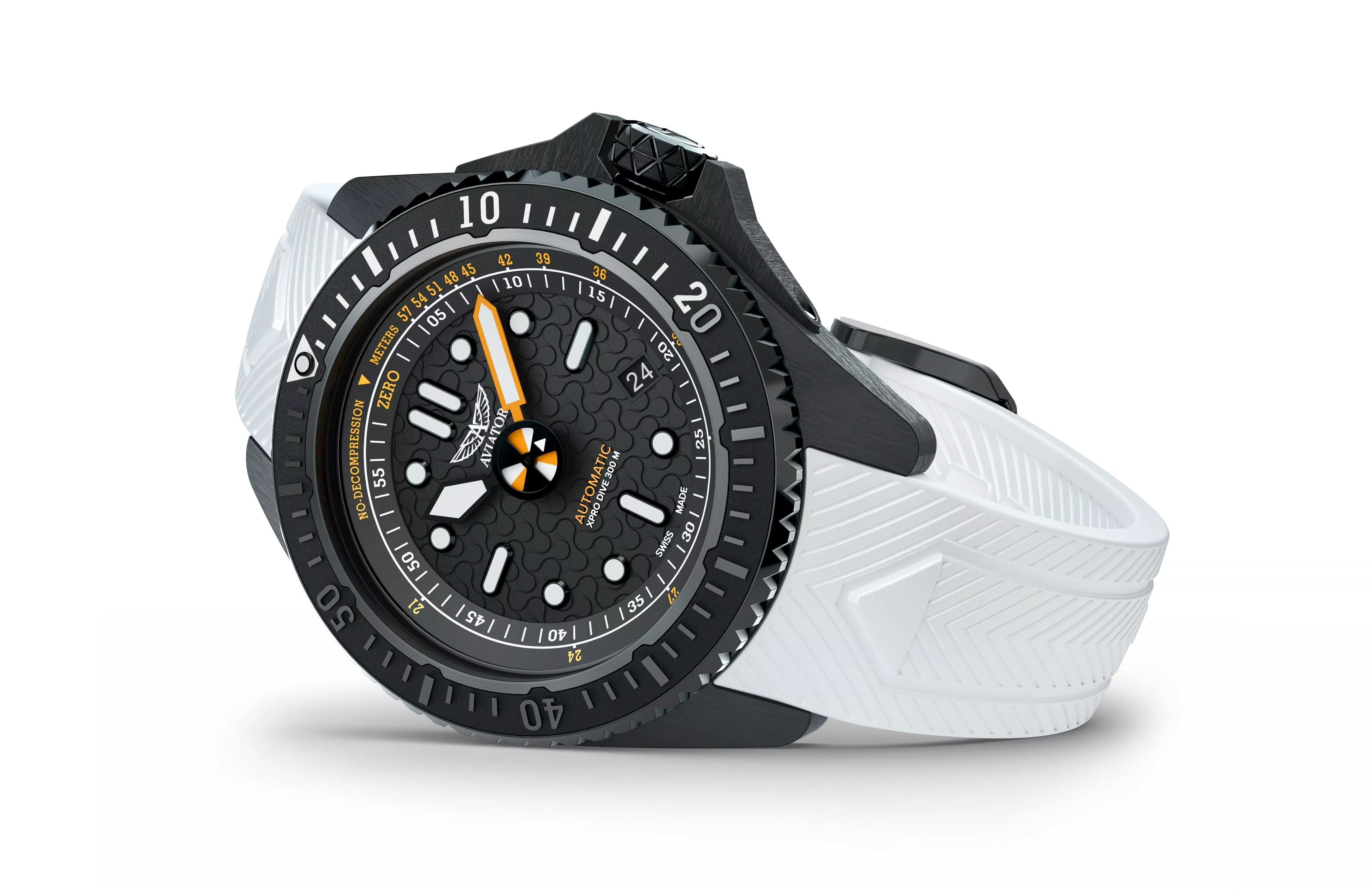 AVIATOR XPRO DIVE BREATHER DIVE 300 AUTO 是一款雙環境工具腕錶,旨在在兩個世界中脫穎而出。它由精密的瑞士自動機芯驅動,在任何環境下都能提供值得信賴的可靠性。其雙重免減壓刻度改編自海豹突擊隊潛水手冊,無論您是在海平面潛水還是探索高海拔水域,都能讓您在安全的時間限制內潛水。整合的呼吸盤——靈感來自海豹突擊隊的箱式呼吸技術——引導穩定的呼吸週期,即使在深水中也能一目了然地確認手錶是否正在運行。單向錶圈提供可靠的安全性和多功能計算,而瑞士 Super-LumiNova® X1 或 BGW9 夜光材質確保錶盤在完全黑暗的環境中仍然清晰易讀。 XPRO DIVE 堅固而精緻,配有琺瑯或氧氣泡圖案錶盤可供選擇,可輕鬆融入冒險生活——從海洋潛水到山間小徑,從駕駛艙飛行到海上運動度假。它不僅是經典潛水錶的演變,更是一種新型潛水錶——真正連結海洋和天空的世界。