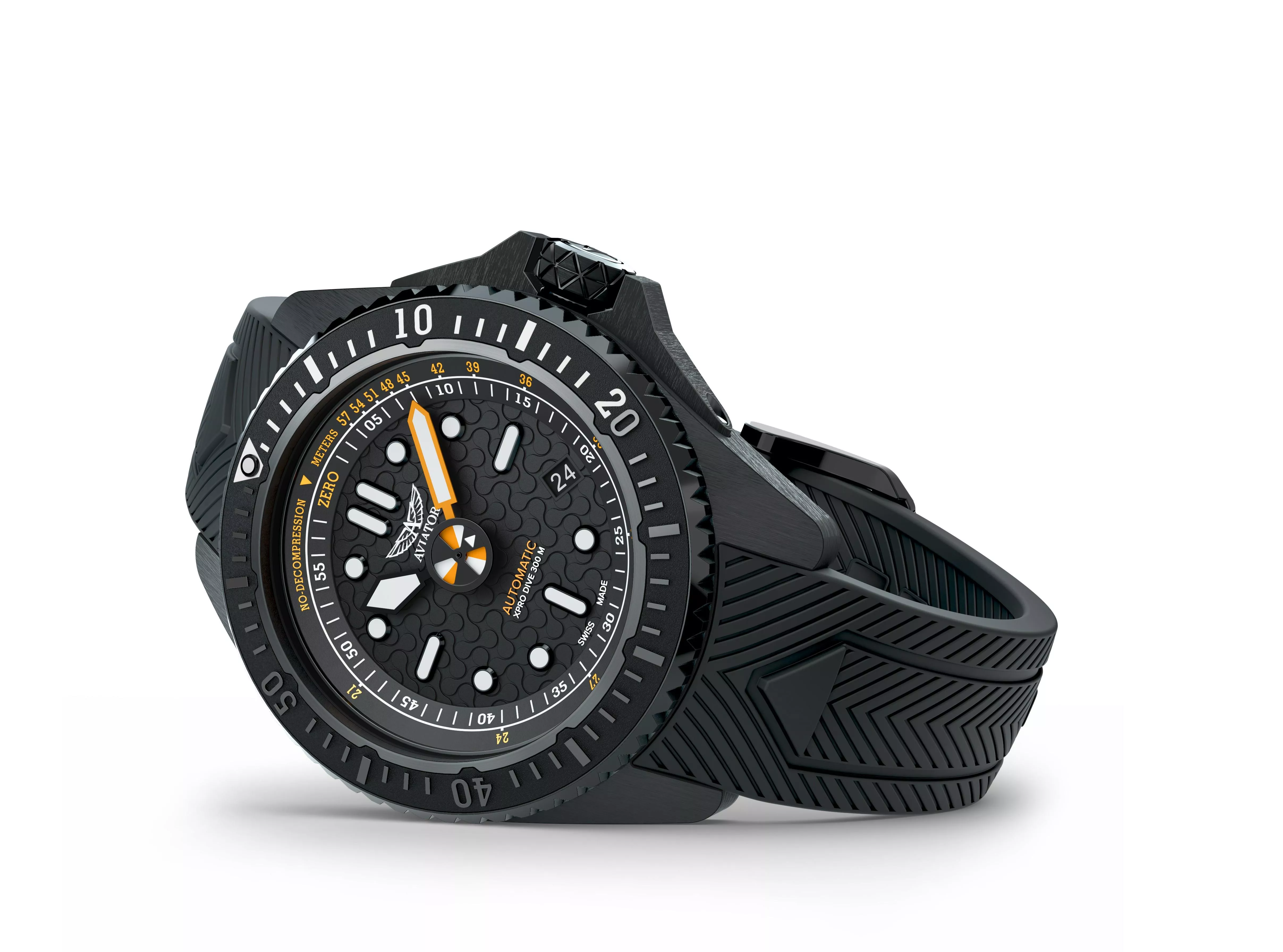 AVIATOR XPRO DIVE BREATHER DIVE 300 AUTO 是一款雙環境工具腕錶,旨在在兩個世界中脫穎而出。它由精密的瑞士自動機芯驅動,在任何環境下都能提供值得信賴的可靠性。其雙重免減壓刻度改編自海豹突擊隊潛水手冊,無論您是在海平面潛水還是探索高海拔水域,都能讓您在安全的時間限制內潛水。整合的呼吸盤——靈感來自海豹突擊隊的箱式呼吸技術——引導穩定的呼吸週期,即使在深水中也能一目了然地確認手錶是否正在運行。單向錶圈提供可靠的安全性和多功能計算,而瑞士 Super-LumiNova® X1 或 BGW9 夜光材質確保錶盤在完全黑暗的環境中仍然清晰易讀。 XPRO DIVE 堅固而精緻,配有琺瑯或氧氣泡圖案錶盤可供選擇,可輕鬆融入冒險生活——從海洋潛水到山間小徑,從駕駛艙飛行到海上運動度假。它不僅是經典潛水錶的演變,更是一種新型潛水錶——真正連結海洋和天空的世界。